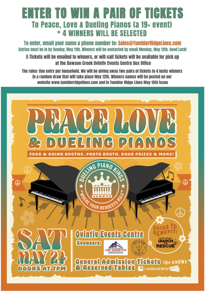 To Enter email your name and phone number to Sales@TumblerRidgeLines.com by midnight Sunday May 11. You are welcome to also call us at 236-846-2188 for ticket entry or send a message on messenger through our Facebook page. See below poster for more details.
