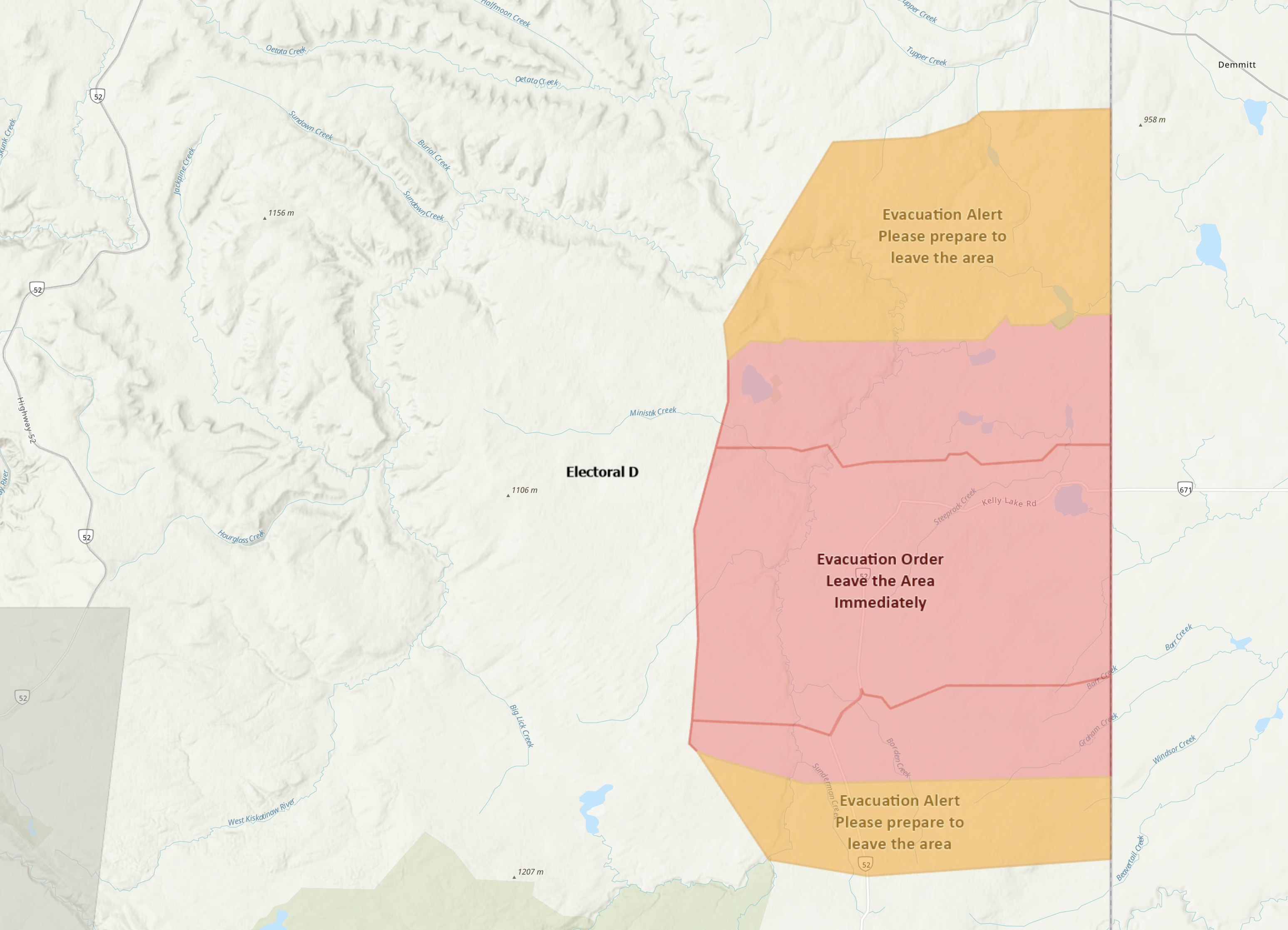 Ryan Kirkham is the Emergency Operations Centre Director for the Kiskatinaw River Wildfire for the PRRD. He says their goal is to support the communities impacted by the wildfires. “The RCMP and the ground search and rescue have helped facilitate the evacuation of residents in the impacted areas. We provide as much advance notice as possible on all our channels, including our website, Facebook, and through Northeast BC alerts, as well as emergency public alerts for news alerts or orders. The EOC and BC Wildfire urge residents from an abundance of caution to ensure everyone is out of the evacuation order area given the extreme fire behavior we’re being seen in the area.”