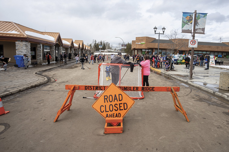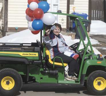 On April 3, as part of the District’s ten days of Hockeyville, the District drove the Zamboni about town, escorted by the RCMP and other luminaries, including Theresa Nevills (top left), the Vancouver Island retiree who nominated Tumbler Ridge for the Hockeyville prize and who drove up here along with her husband and two pups when Tumbler Ridge made the top two.